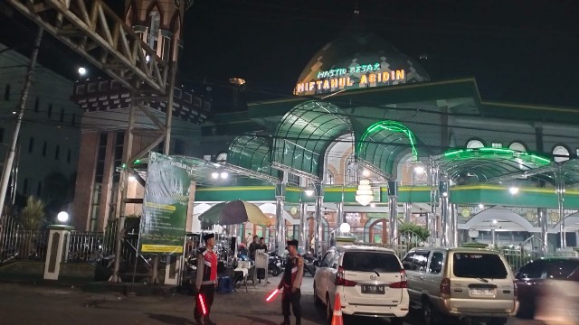 Personel kepolisian melakukan pemantauan di sekitar area masjid serta jalur lalu lintas guna mencegah potensi gangguan keamanan, seperti pencurian kendaraan dan kemacetan.