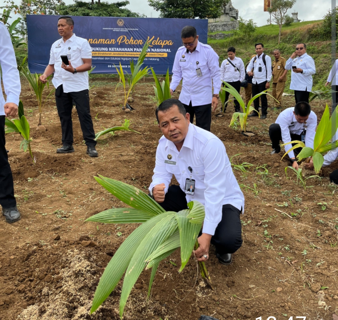 MALANG – Dalam rangka mendukung program ketahanan pangan nasional, Kementerian Imigrasi dan Pemasyarakatan (Kemenimipas) menggelar penanaman bibit pohon kelapa secara serentak di seluruh Indonesia, Selasa (9/9). Kegaiatan tersebut dilaksanakan secara terpusat di Nusakambangan.