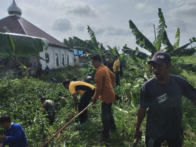 Kapolsek Krian Kompol I Gede Putu Atma Giri bersama anggota Polsek bergabung dengan personel TNI dari Koramil Krian, serta perangkat Desa Junwangi dan warga melaksanakan kerja bakti gotong royong membersihkan aliran sungai dari enceng gondok dan sampah.