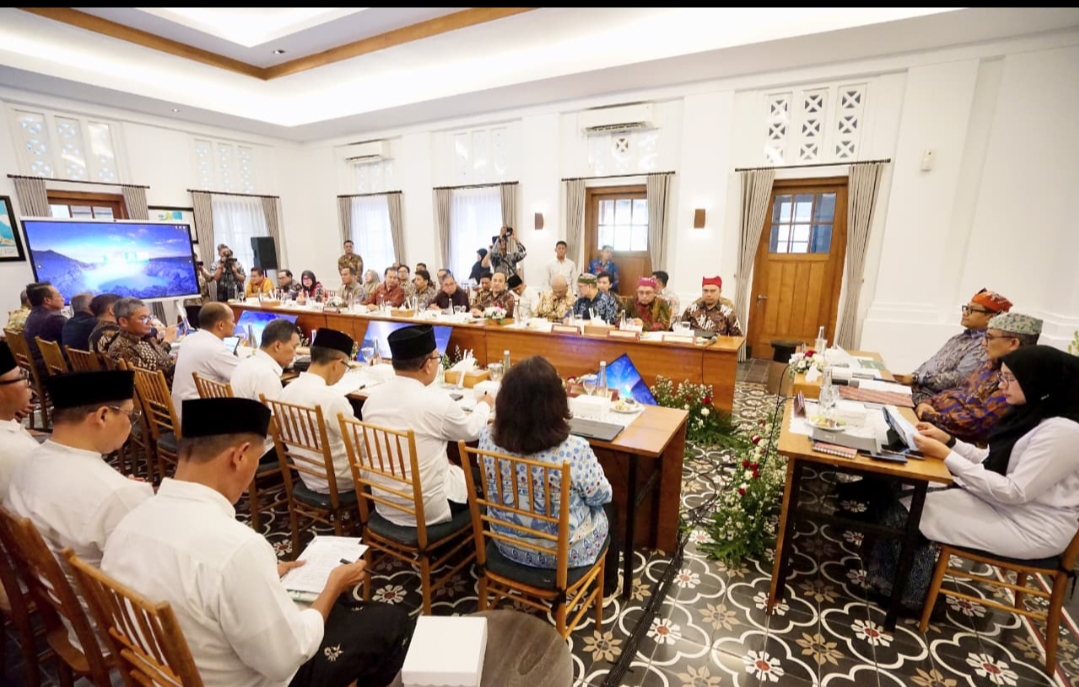 Rakor Pembangunan JLS berlangsung di Pendopo Sabha Swagata Blambangan Banyuwangi, Jumat (24/10/2025). Rakor dipimpin oleh Pimpinan Pemeriksaan Keuangan Negara VII Slamet Edy Purnomo, Pimpinan Pemeriksaan Keuangan Negara III Akhansul Khaq dan Bupati Banyuwangi Ipuk Fiestiandani.