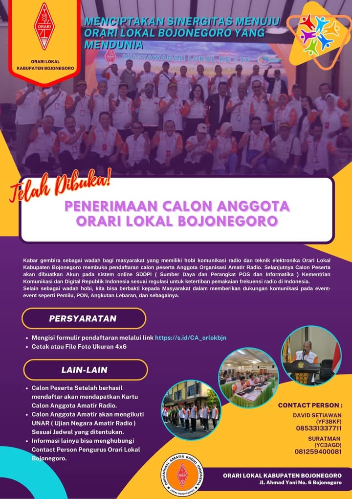 Adapun informasi lainnya bisa menghubungi pengurus Orari Lokal Bojonegoro dengan kontak person David Setiawan (YF3BKF) 085331337711 atau Suratman (YC3AGD) 081259400081.[fif/nn]