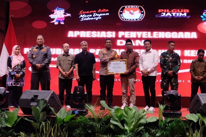 Pada moment ini mendampingi Ketua KPU Sidoarjo, Plt Bupati Sidoarjo memberikan penghargaan kepada Polresta Sidoarjo, Kodim 0816, Kejaksaan Negeri Sidoarjo, Satpol PP dan Dinas Kependudukan dan Pencatatan Sipil Kabupaten Sidoarjo. (Sis)