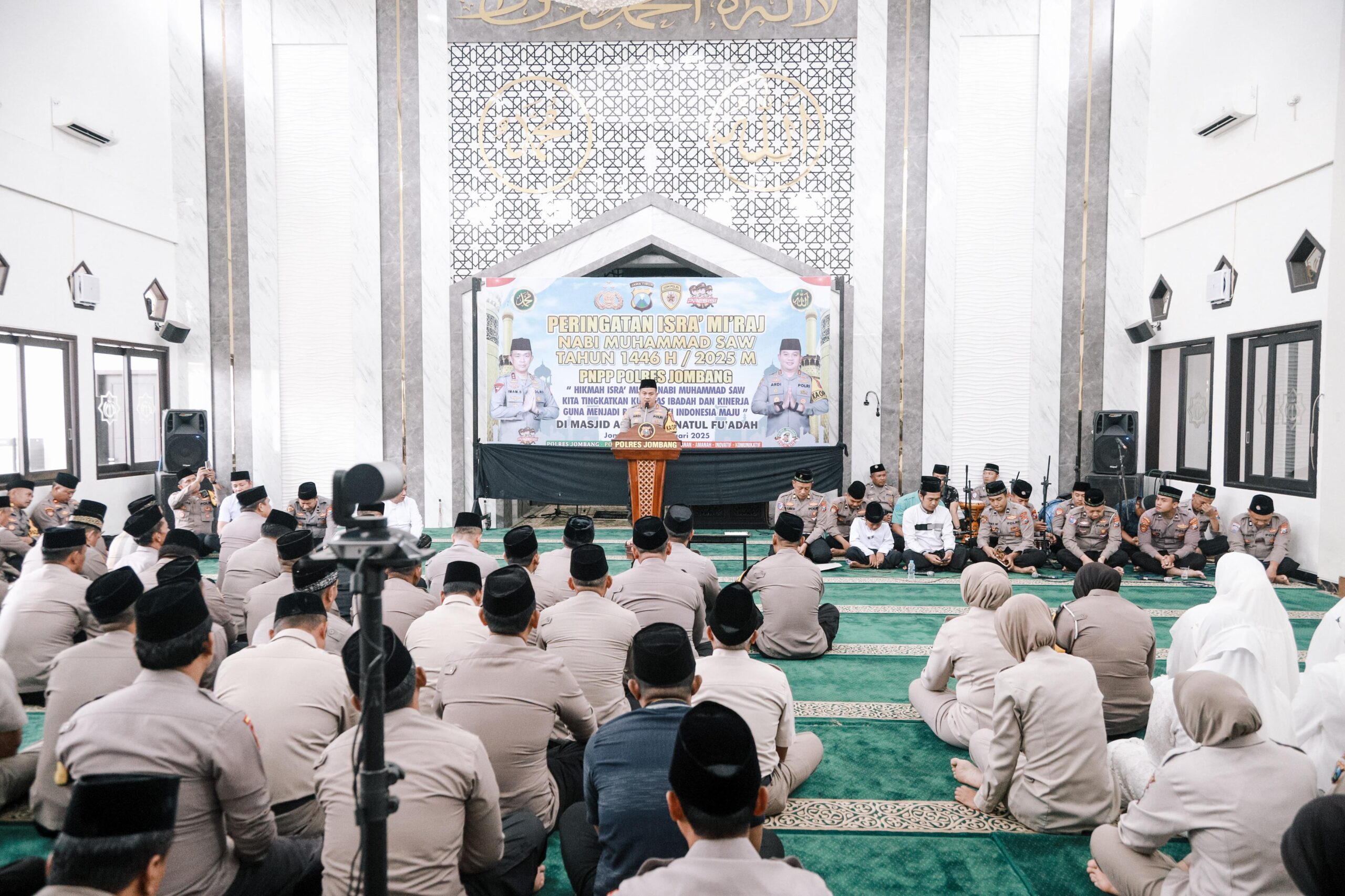 Peringatan Isra’ Mi’raj Nabi Muhammad SAW tahun 1446 H/ 2025 M digelar di Masjid Agung Junnatul Fuaddah Polres Jombang, Kamis (30/1/2025). Isra Mir’aj tersebut Kapolres Jombang AKBP Ardi Kurniawan,S.H., S.I.K., CPHR Pejabat Utama Polres Jombang, Ketua Cabang beserta pengurus bhayangkari dan Personil Polres Jombang.