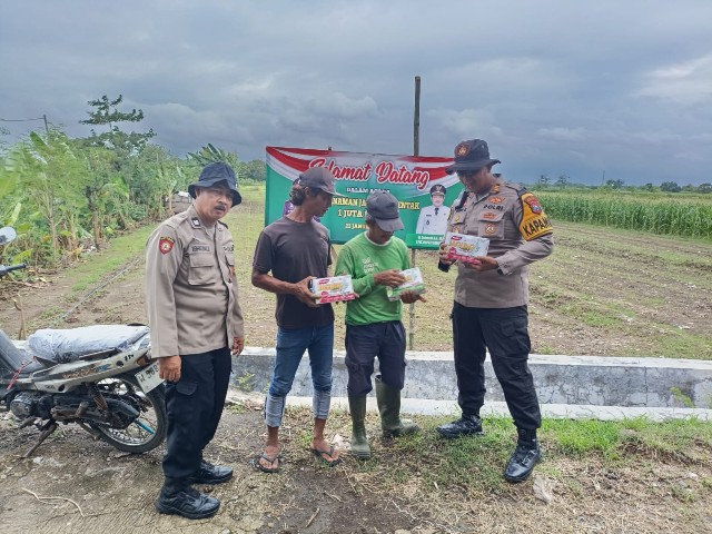 “Penyerahan pupuk penyubur dan pembasmi hama bagi tanaman jagung yang sudah berusia 14 hari dan 40 hari ini sangat penting, agar hasil panen petani dapat optimal,” ujar Kapolsek Balongbendo AKP Sugeng Sulistiyono.